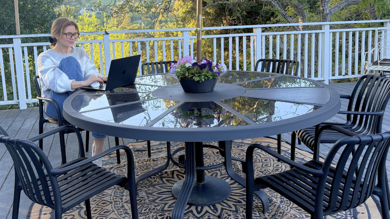 Sludge was the way to go with this table. It plays well with pops of color that can be ever changing. The rug is a nice anchor piece. No shouting matches for dominance. Happy deck weather