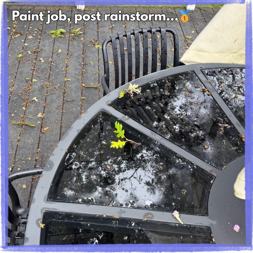 Our newly refreshed patio table has been hard at work for a couple of weeks now, experiencing both sunny, warm days in the mid-80s as well as a couple of full-blown rainstorms, and is holding up like a champ! The power of a good, simple paint job never ceases to amaze me, and this table’s makeover was no exception.